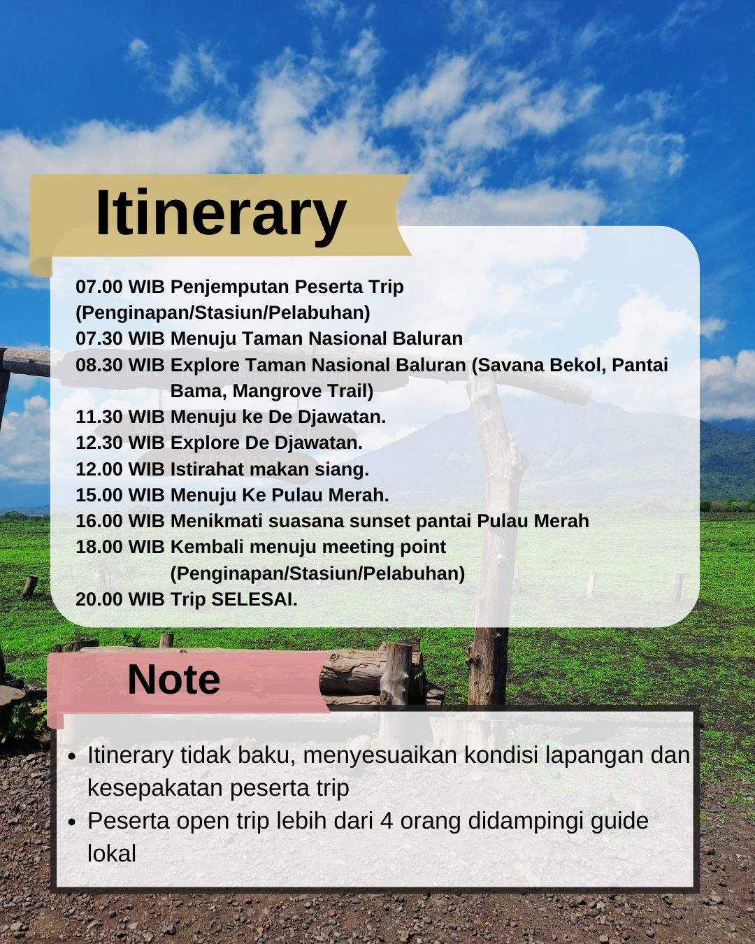 Kamu akan kami ajak menjelajahi indahnya Taman Nasional Baluran yang lebih dikenal dengan sebutan Africa Van Java meliputi : (Savana Bekol, Pantai Bama, dan Dermaga Mangrove). Setelah dari Baluran, kalian akan kami ajak menjelajah ke Hutan Djawatan, hutan yang indah dengan banyaknya pohon Trembesi yang gagah, serta vibes yang sangat magical seperti layaknya film Lord Of The Rings. Setelah itu di akhir trip, kami akan mengajak kalian semua menikmati indahnya sunset di pantai Pulau Merah.