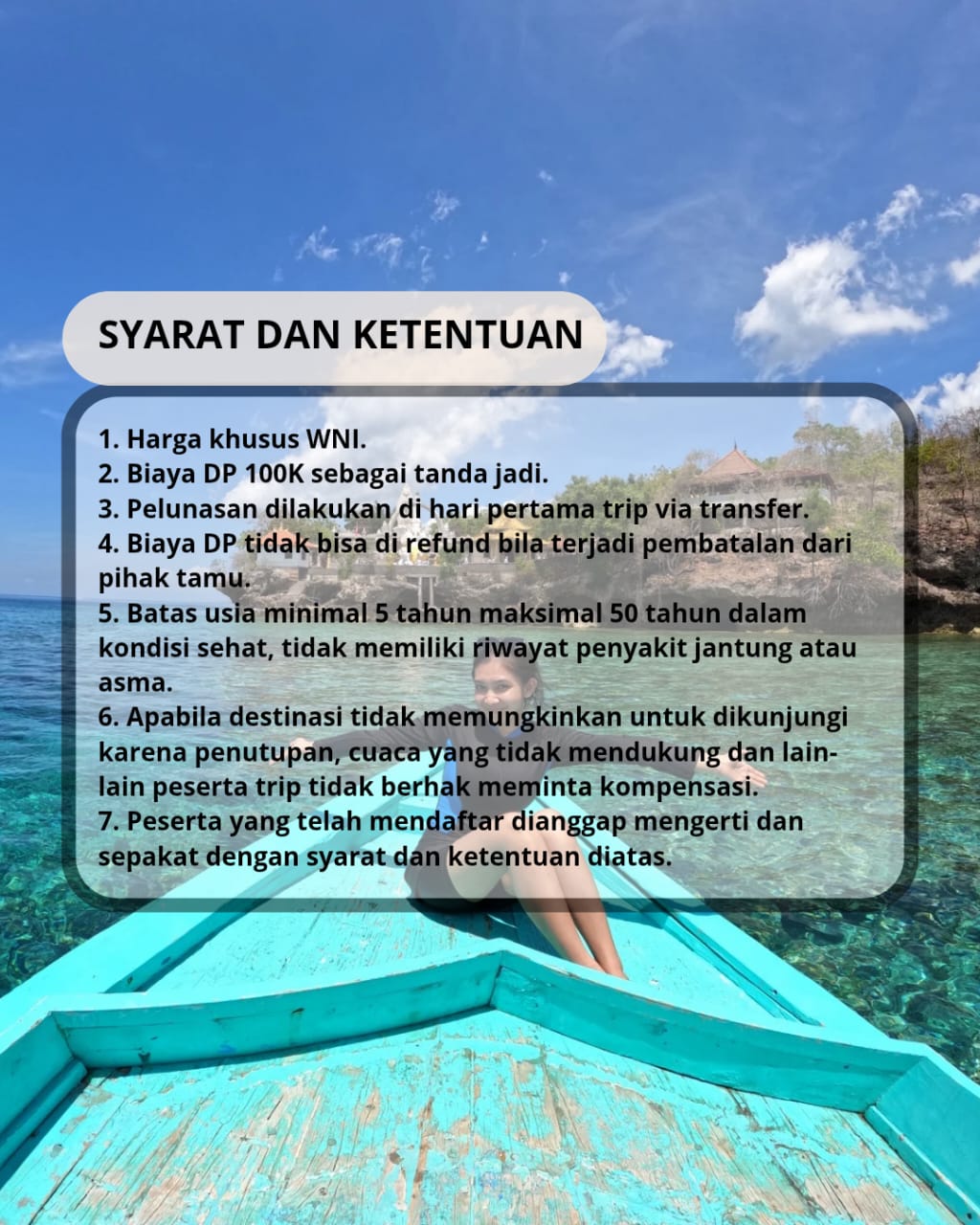 6. Apabila destinasi tidak memungkinkan untuk dikunjungi karena penutupan, cuaca yang tidak mendukung dan lain-lain peserta trip tidak berhak meminta kompensasi.