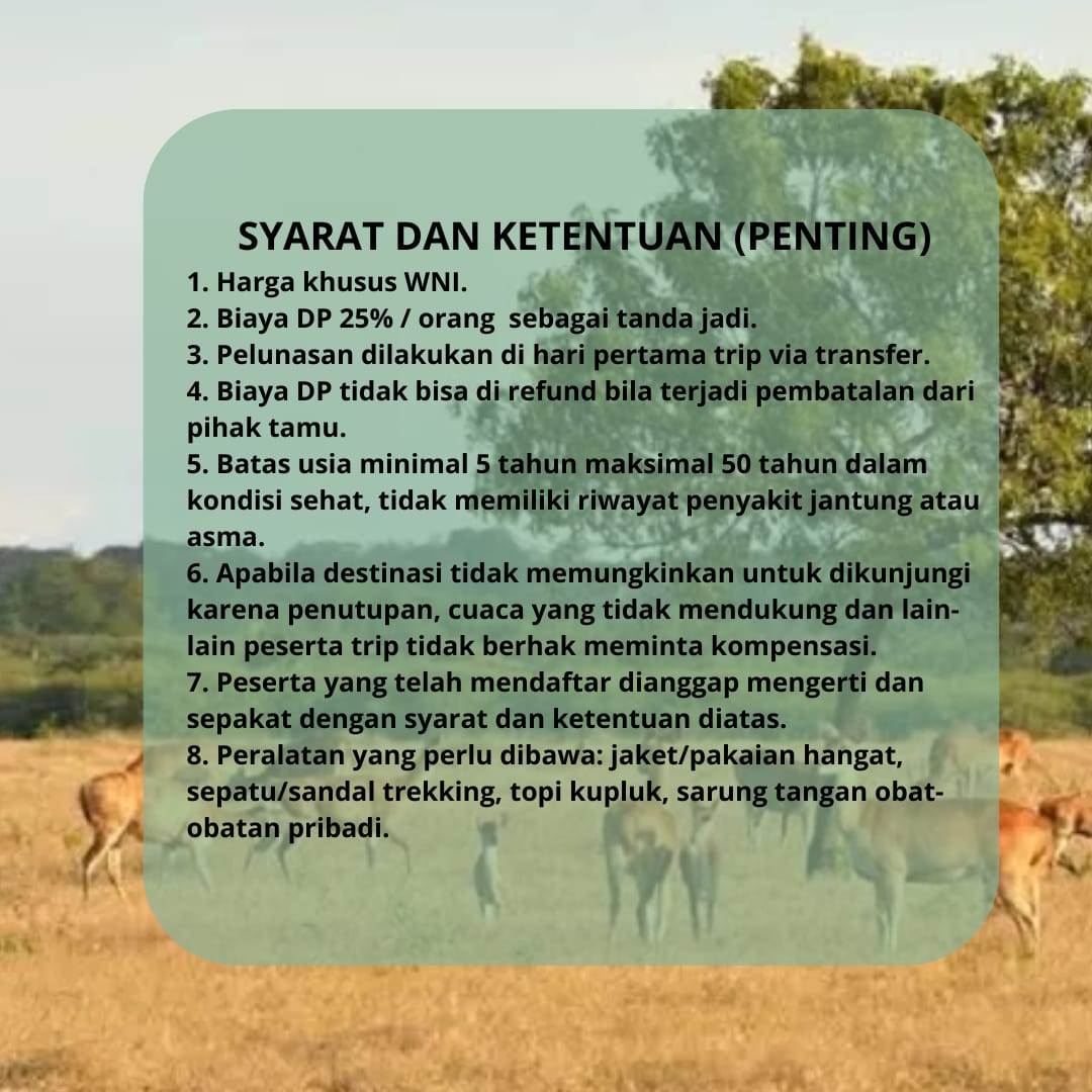 6. Apabila destinasi tidak memungkinkan untuk dikunjungi karena penutupan, cuaca yang tidak mendukung dan lain-lain peserta trip tidak berhak meminta kompensasi.